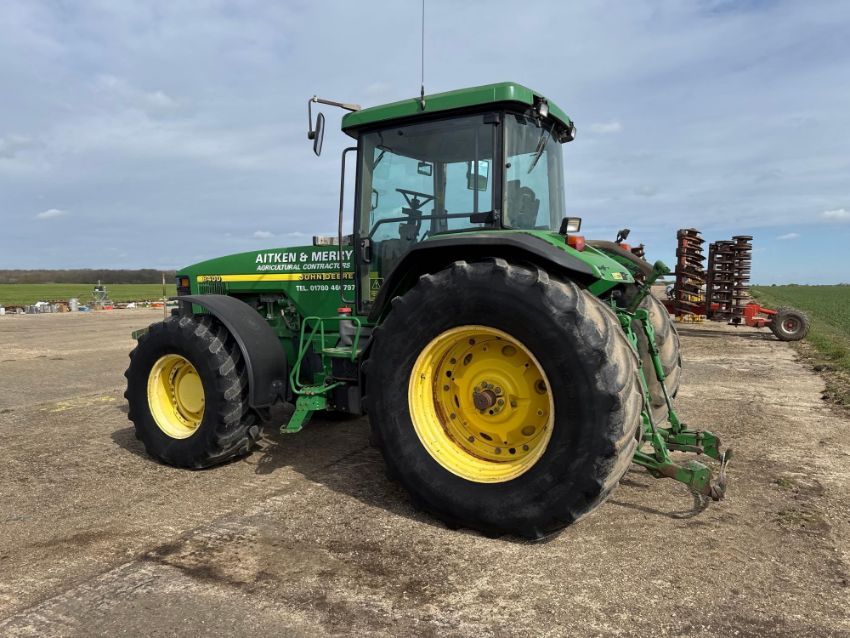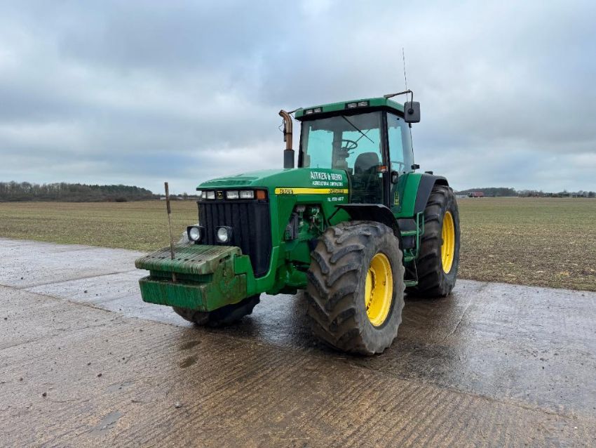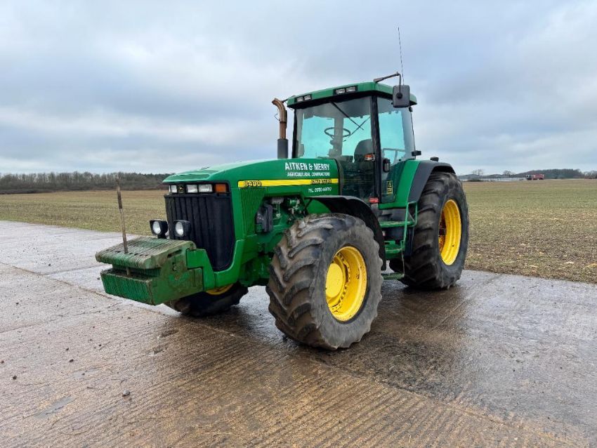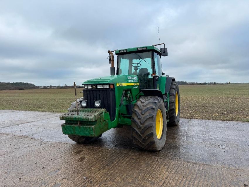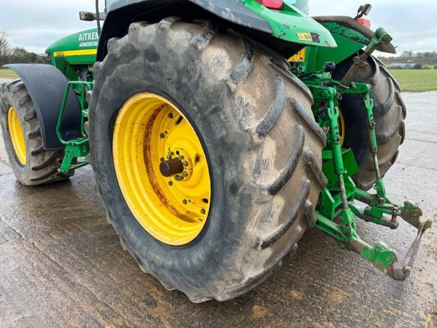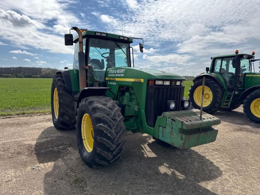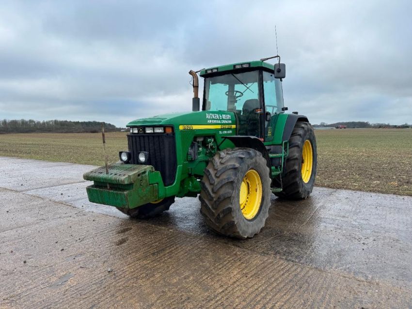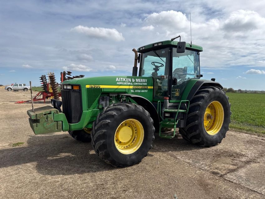 2000 John Deere 8400 4wd tractor, Powershift gearbox, 4No electric spools, 20No front wafer weights on Firestone 600/65R28 front and 710/70R38 rear wheels and tyres. Reg: W488 YFL. Hours: 7,970. Serial No: RW8400P02790