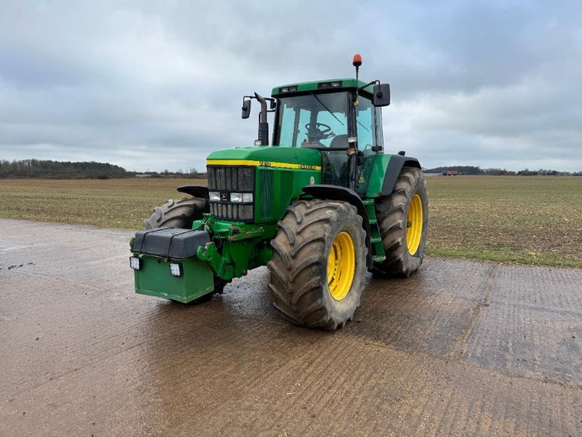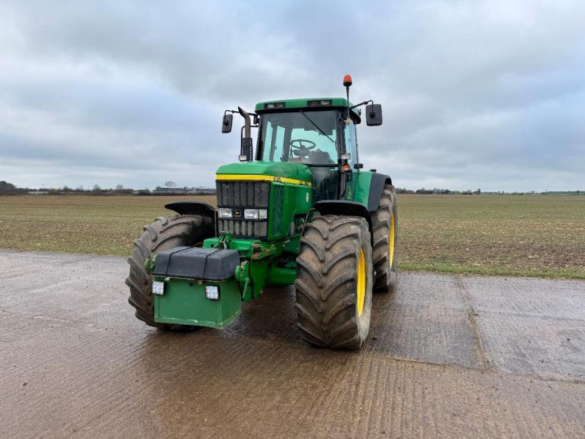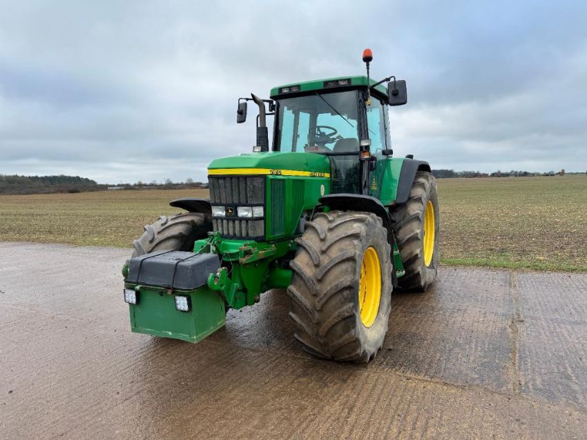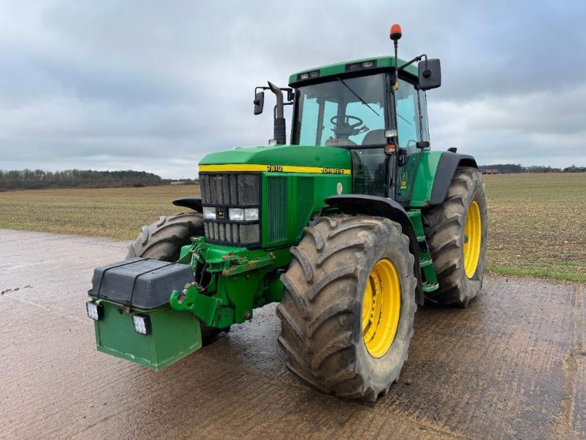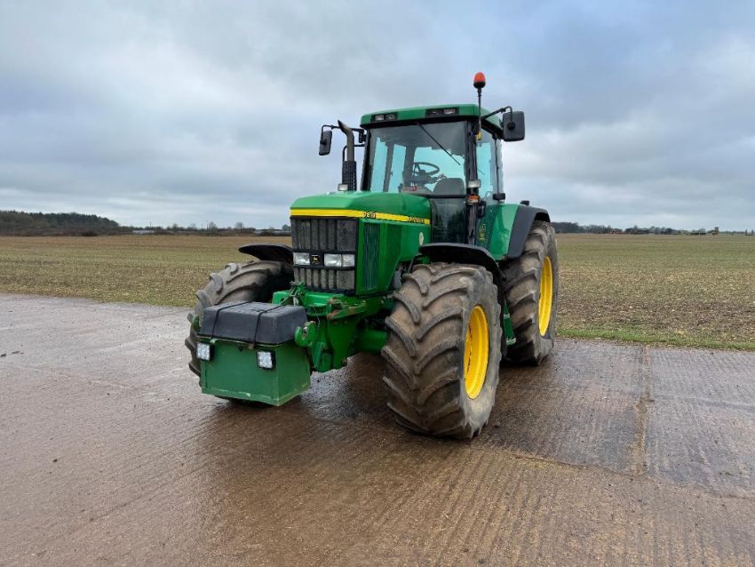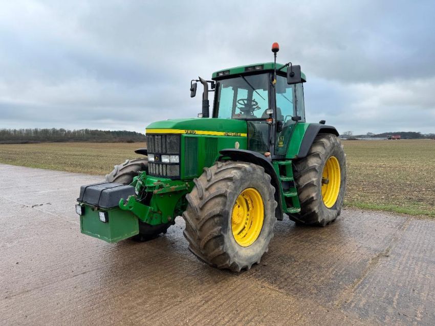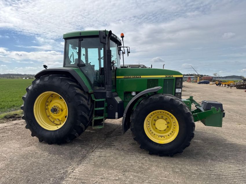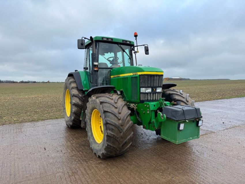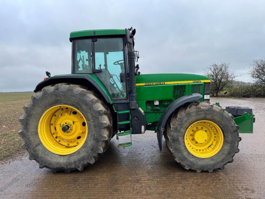 2002 John Deere 7810 40kph PowerQuad 4wd tractor, 3No manual spools, Sauter front linkage, front suspension on Firestone 600/65R28 front and BKT 710/70R38 rear wheels and tyres with front toolbox. Reg: FY02 YBM. Hours: 8,691. Serial No: RW7810R076783