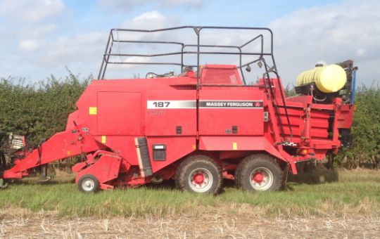 2004 Massey Ferguson 187 Square Baler, roller tailgate, ejectors, tandem steered axlem chopper, knotted blower, 80,000 bales. professionally serviced and maintained. Includes Balers Choice Applicator and 200ltr of Balers Choice Liquid. Approximately 9' x 20' x 12' in size. Location Huntingdon, Cambridgeshire