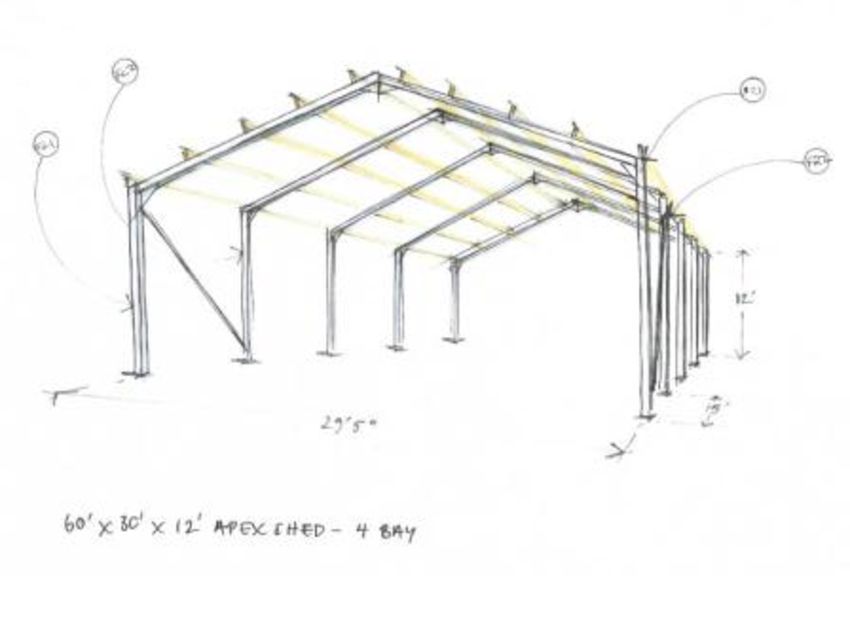 Steel Framed Building 60 ft long x 30 ft wide x 12 ft to eaves, 12.5 deg roof 4x 15 ft bays, 10 no stantions 178 x 102 x 19kg, 10 no trusses 152 x 89 x 16 kg, 2 no wind braces 60 x 60 x 4 rhs, 32no purlins 175 x 75 treated green, bolt kit containing 92 no m 16 x 45 bolts and nuts, 130no m12 x 90 coach bolts, nuts and washers. Location Blandford, Dorset