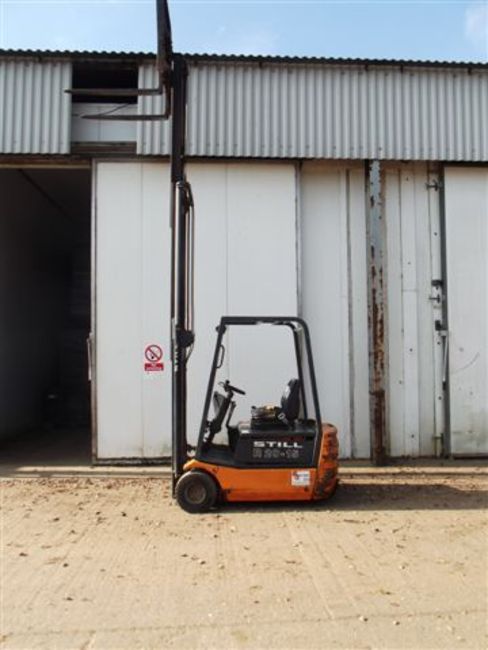 Still R20-15 Electric Fork Lift Truck. 1500kg cpacity. Overall height 1990mm, overall width 1100mm, length to front of mast 2020mm, fork length 1000mm, triplex mast lift height 4200mm. Side shift. 2 lights. 3 wheeled with double rear wheel, solid tyres. Includes charger. Location Spalding, Lincolnshire