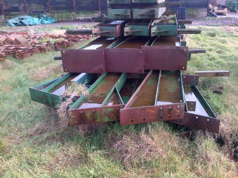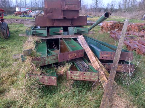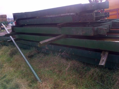 Industrial Spec Building Frame, clear span 4 bay building frame kit. Galvanised Z purlins and brand new nuts and bolts worth over £400. Width approx. 47', length approx 97' and height 12' to eaves. Frame undercoated with oxide primer and finished with green top coat. Posts length varied to allow for falling ground level.
