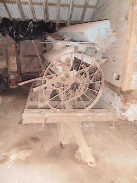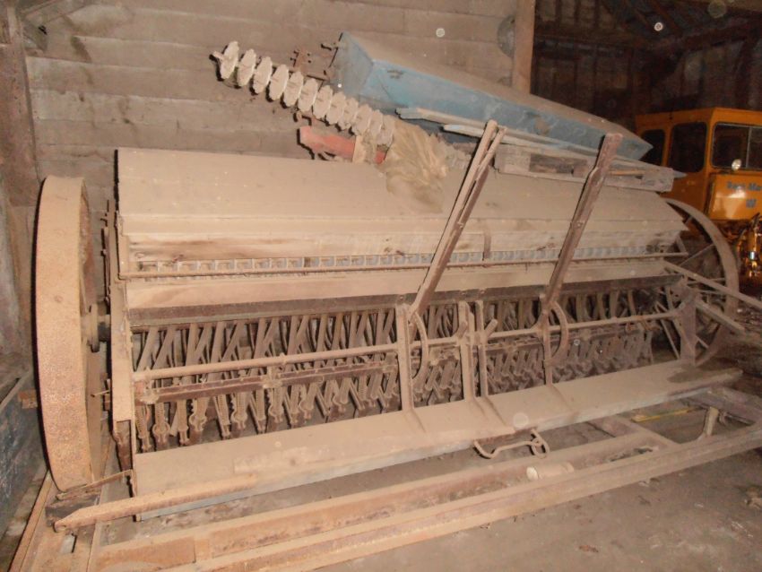 Vintage Penny Porter Grass Drill c/w low loader and spare set of cups for bigger seed, steel wheels with a wooden box, 10ft