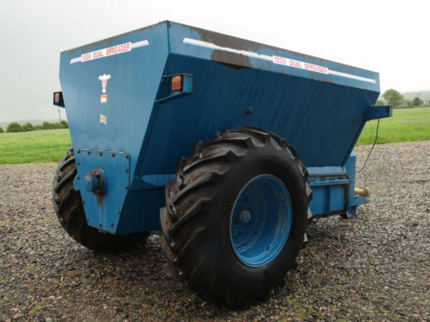 West 1300 dual spreader, (1994) stone trap, hyd brakes, road lights, shearbolt PTO, on Olympic 18.4 r 26 tyres - Location - Market Drayton, Shropshire