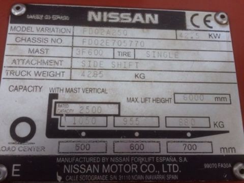 Nissan 25 Diesel Forklift. 2.5 tonne, 6m lift in 3 stages, 13025 hours. Restored at 8,000 hours by Carrylift. With side-shift, full service history, roof lights and rear lamp. Location Deeping St. Nicholas, Lincolnshire