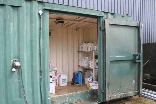 2002 Chemical Store 12ft x 8ft. Made by CJ Supplies. Bunded. 2 levels of fitted shelves. Fitted electrics including fan, light and socket. Securely locked. Will be fully disconnected form the mains. Outside green inside white. Location Milton Keynes, Buckinghamshire