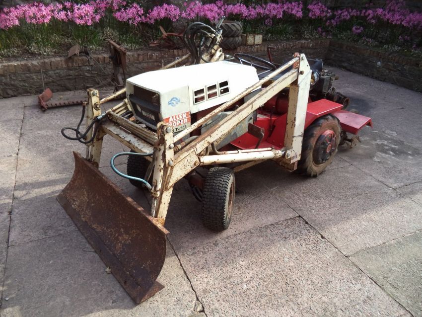 Allen Roper RT13 Compact Tractor c/w Loader. Age not known, approximately 1970's, in running order. To be sold c/w Loader Attachments - Yard Scraper, Interchangeable Fork / Bucket to be sold c/w following implement attachments - Chain Drive independent Roto-Tiller c/w & HP Engine (GWO), Single Furrow conventional plough, Finger Bar Mower and dual wheels c/w spacers. The loader will lift a Round Bale of Silage. No VAT. Location: Taunton, Somerset.