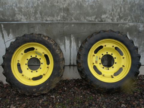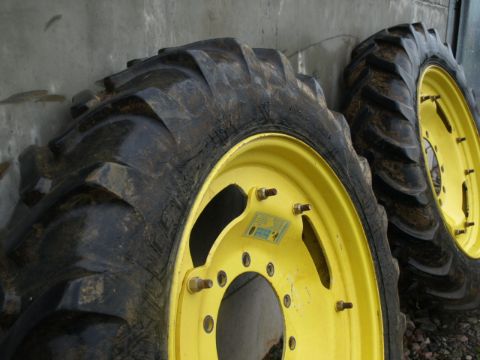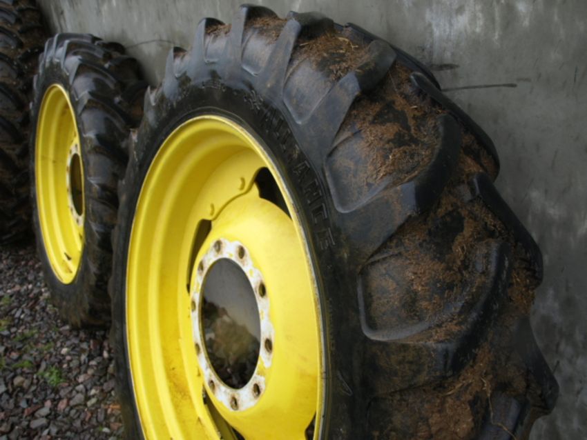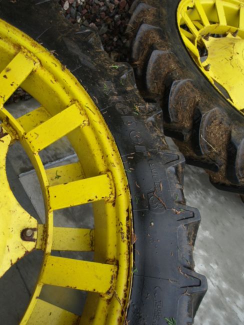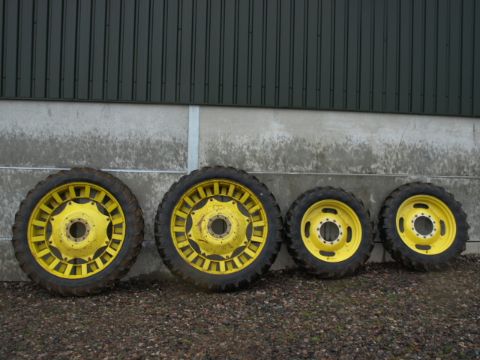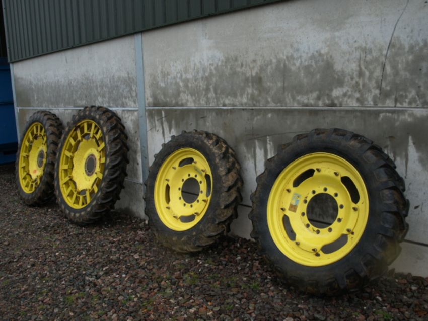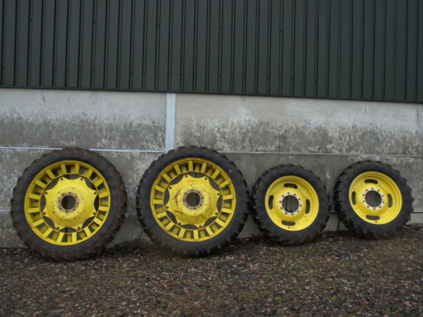 Row crop wheels to suit John Deere 30 series. 6 cylinder came off a 6930. Alliance fronts 11. R32 fronts. Kleber 270 95 R48/ 11.2 R48 rears. One rear rim has been welded as photo shows. Bolt in centres. Location: Market Drayton, Staffordshire.