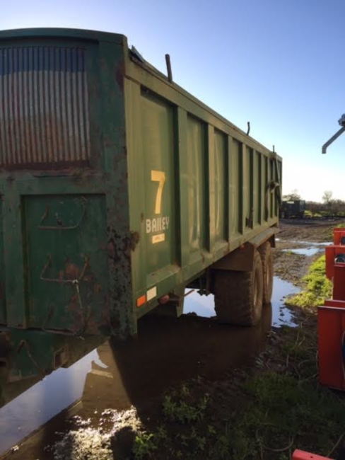 TB 18 Bailey Grain Trailer (T7) (2008). TB 18 tonne grain trailer. Sprung drawbar, 10 stud high speed commercial running gear. Air brakes with ABS, foldaway rear drawbar, Hydraulic back door with grain shoot, rollover sheet. Tyres - 560/60r22.5. Serial No.: 7536-18t. Location: Middlesbrough, North Yorkshire