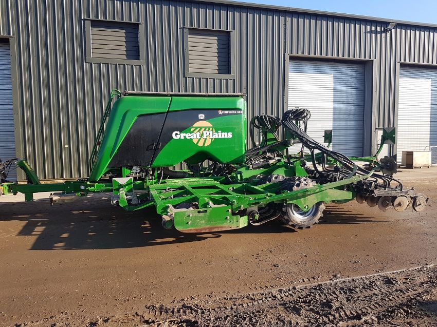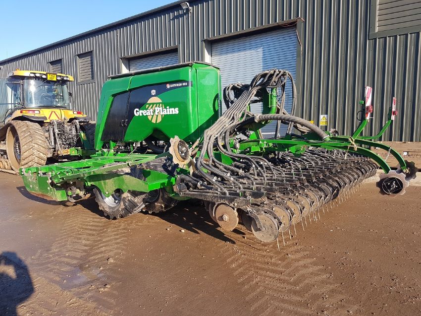 Great Plains Centurion 600 6metre seed only drill (2014). Levelling paddles, discs, electronic control box for tramlines & seed rate calibration, blocked coultor tube censors. Serial No: 1205-060-000036. Location: Driffield, East Riding of Yorkshire