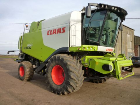 2012 Claas Lexion 660 combine harvester with V750 header and trolley on 900/60R33 front and 600/55-26.5 rear wheels and tyres. Air Conditioned cab. Laser Pilot. Rape side knife and accessories. Reg No. FX12 FVM. VIN C5401136. 1,303 Engine Hours. 1,056 Drum Hours.