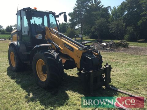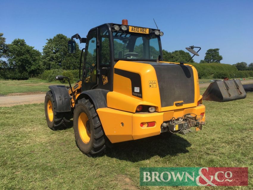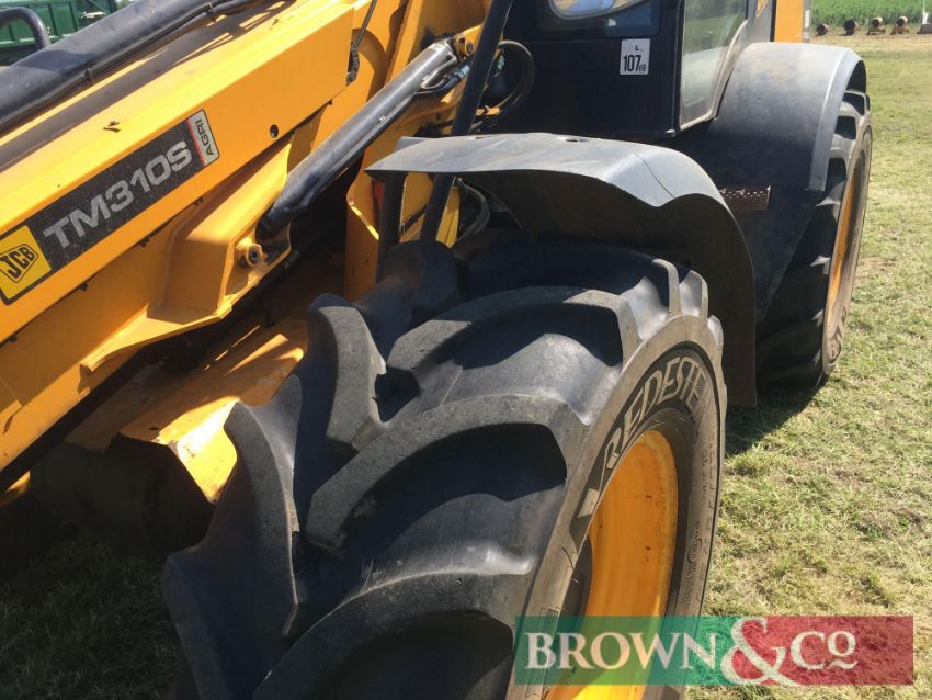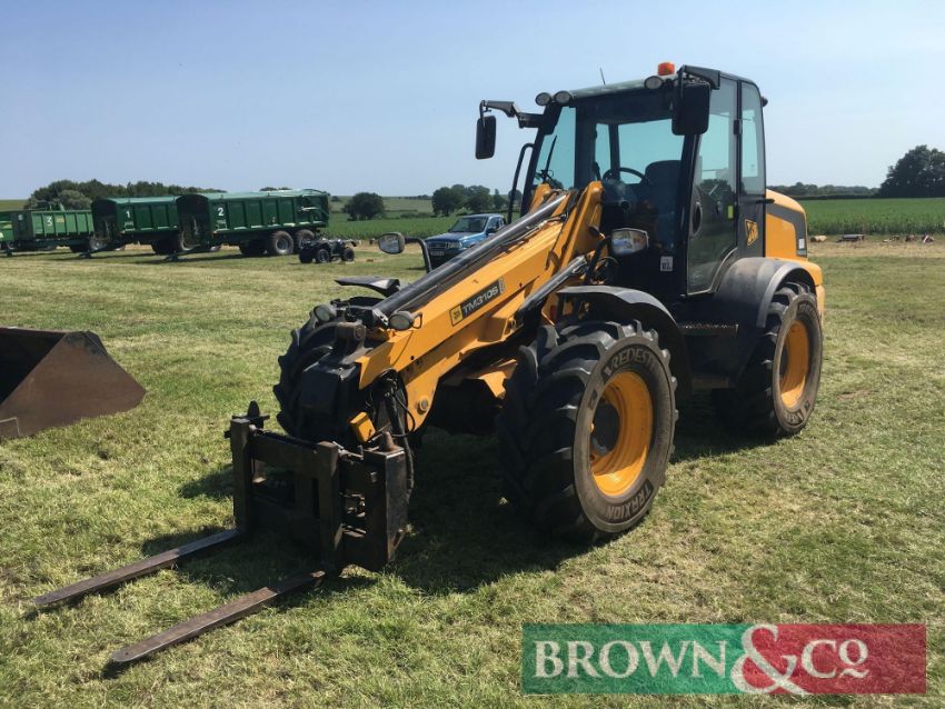 2010 JCB TM310S Agri materials handler with pivot steer, boom suspension, rear pickup hitch, pin and cone headstock on 460/70R24 wheels and tyres with pallet tines. Reg: AE10 HBZ. Hours: 4,628. Serial No: JCB310TSL01315749