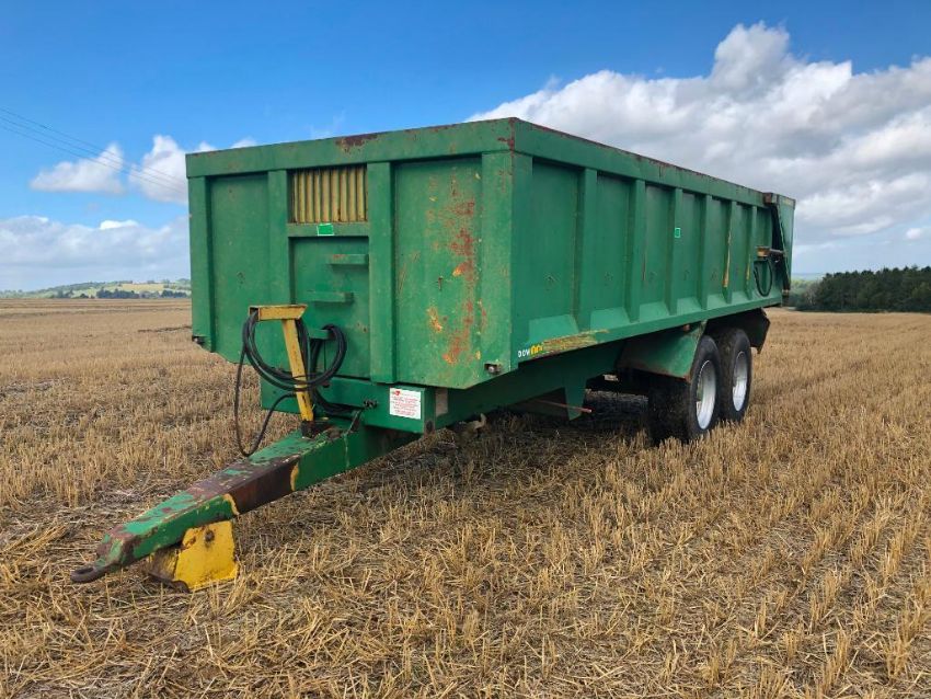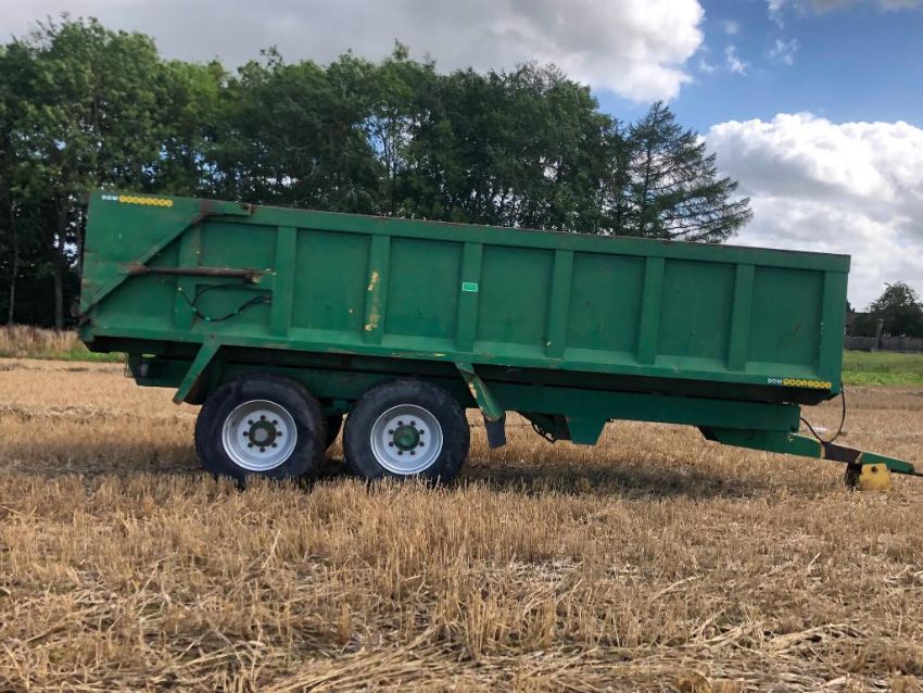 Dow Trailers 12t twin axle grain trailer, hydraulic brakes, sprung drawbar, hydraulic tipping and tailgate with grain chute on 385/65R22.5 wheels and tyres. Serial No: DOW 075