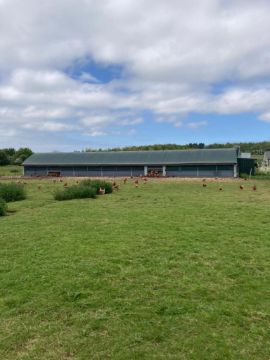 For 1925 birds at 9 birds per square metre. Equipped with big Dutchman feeders, next boxes, seperate egg room, automatic popholes and EPA dusk to dawn dimmer.