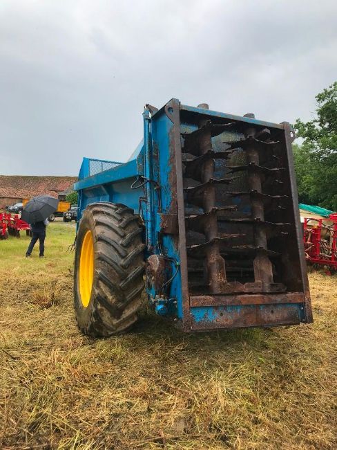 Rear discharge muck spreader with slurry gate, rear beaters, wide angle PTO, hydraulically driven floor.