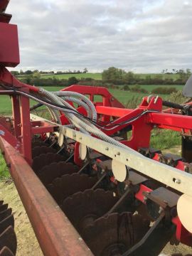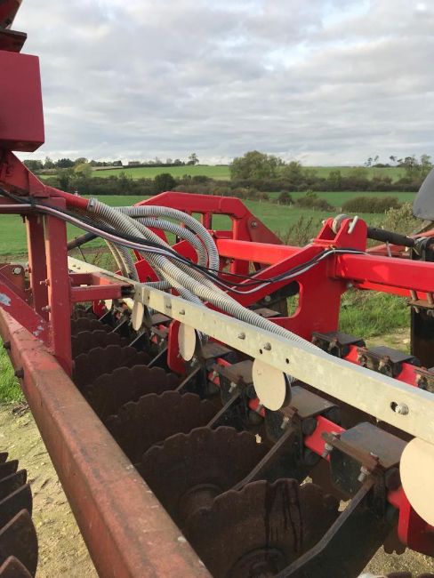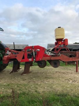 Spaldings, 4 leg, 2.85 metre flatift complete with double disc tool bar, packer roller and Spaldings 8 outlet air seeder. New points and shins, shear bolt protection on legs.