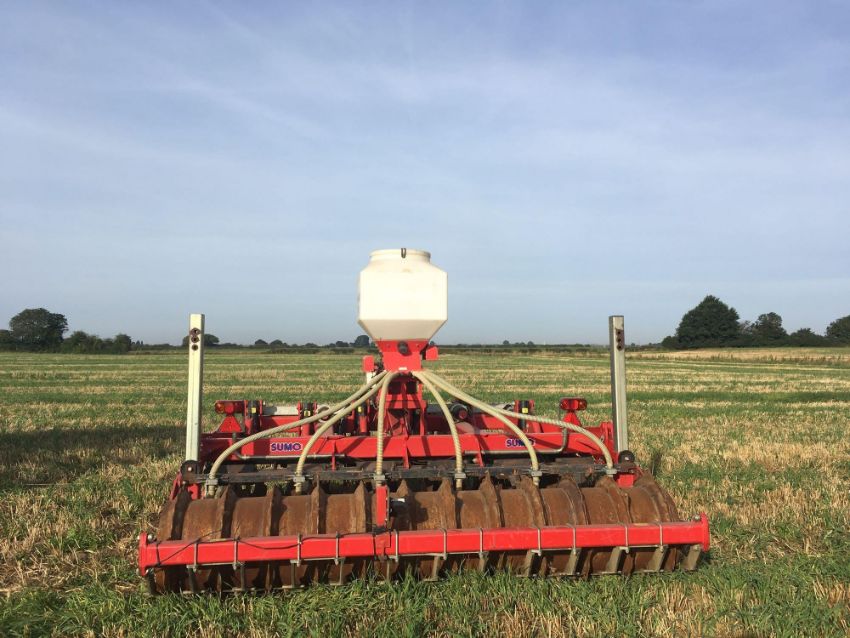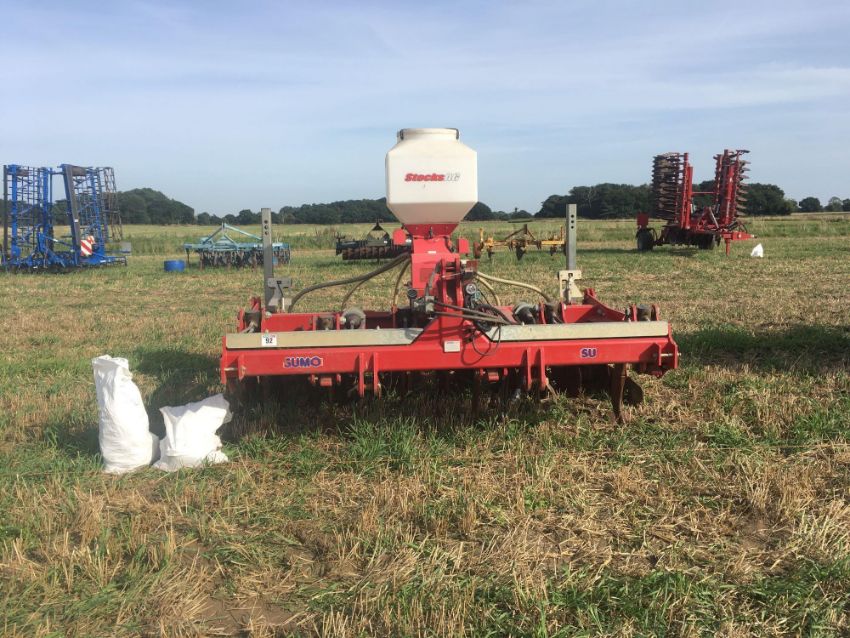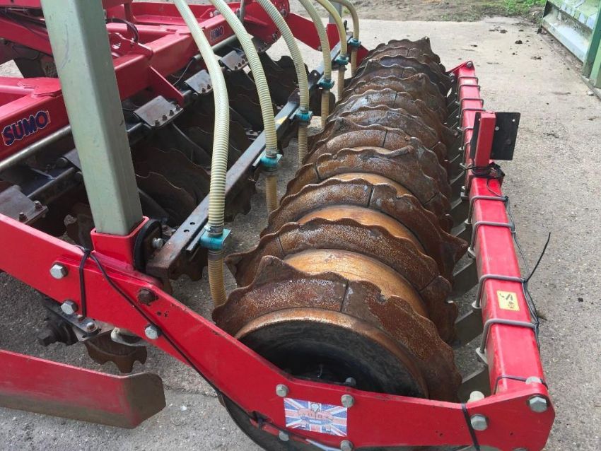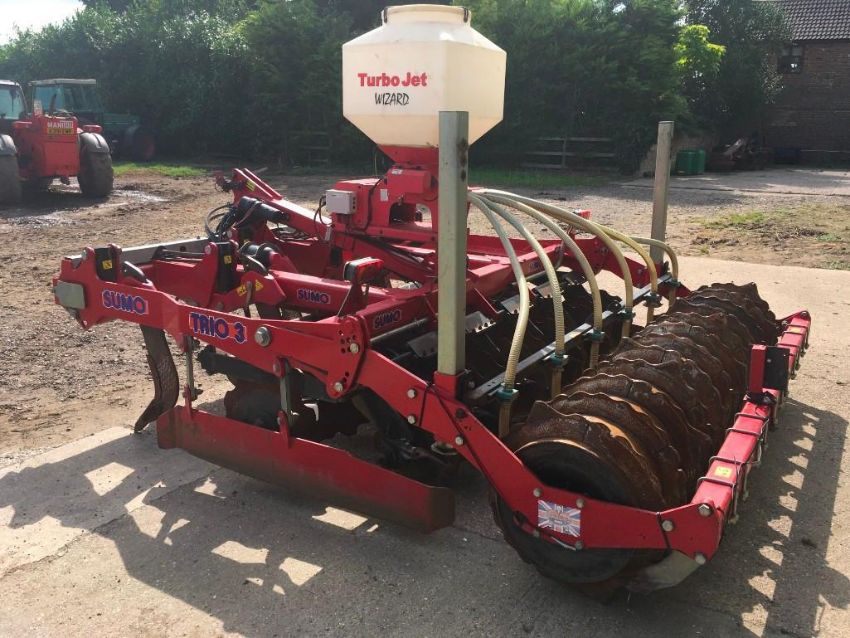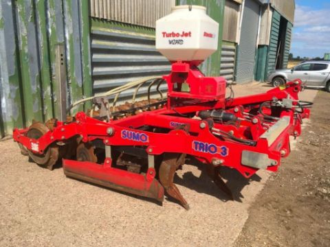 2012 Sumo Trio 3 3m cultivator with 6 legs, 2 rows of discs and multi packer, with auto reset. C/w Stocks AG turbo jet wizard seeder (2008), and qty of spare points, scrapers and other wearing parts. Serial No: 12339.