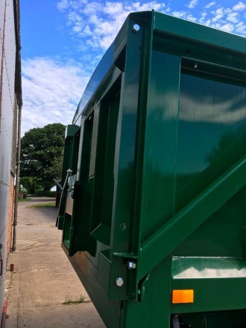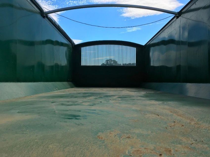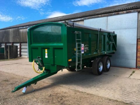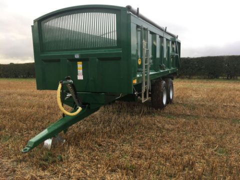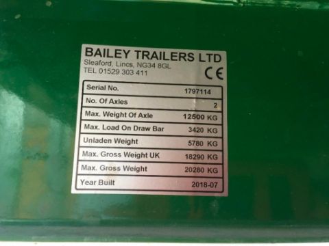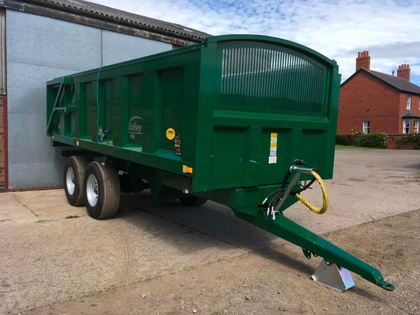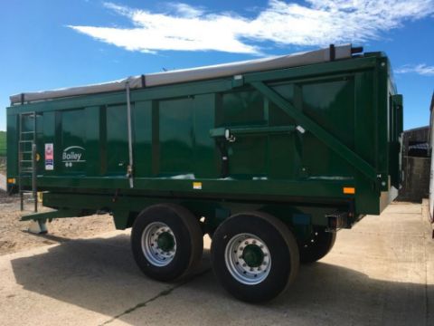 2018 Bailey 14t twin axle trailer, hydraulic back door, manual grain chute, rollover sheet, sprung draw bar on 385/65R22.5 super single wheels and tyres. On farm from new. Serial No: 1797114. Manual in office.