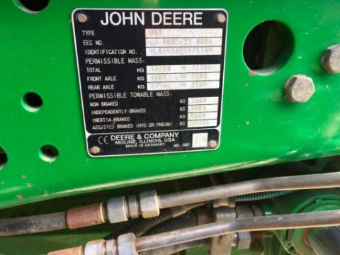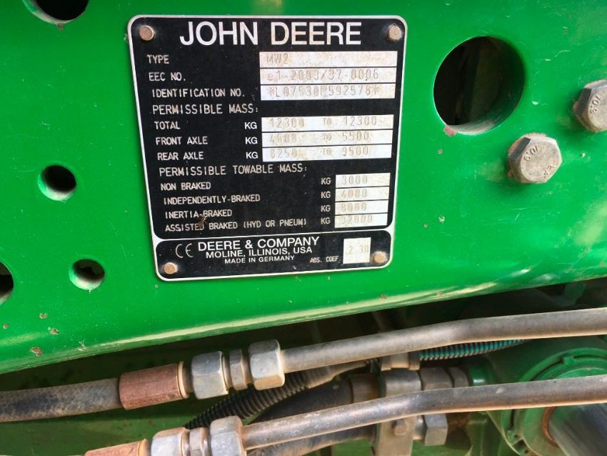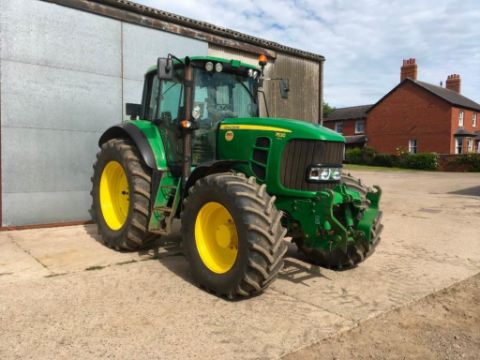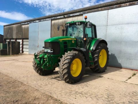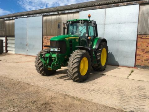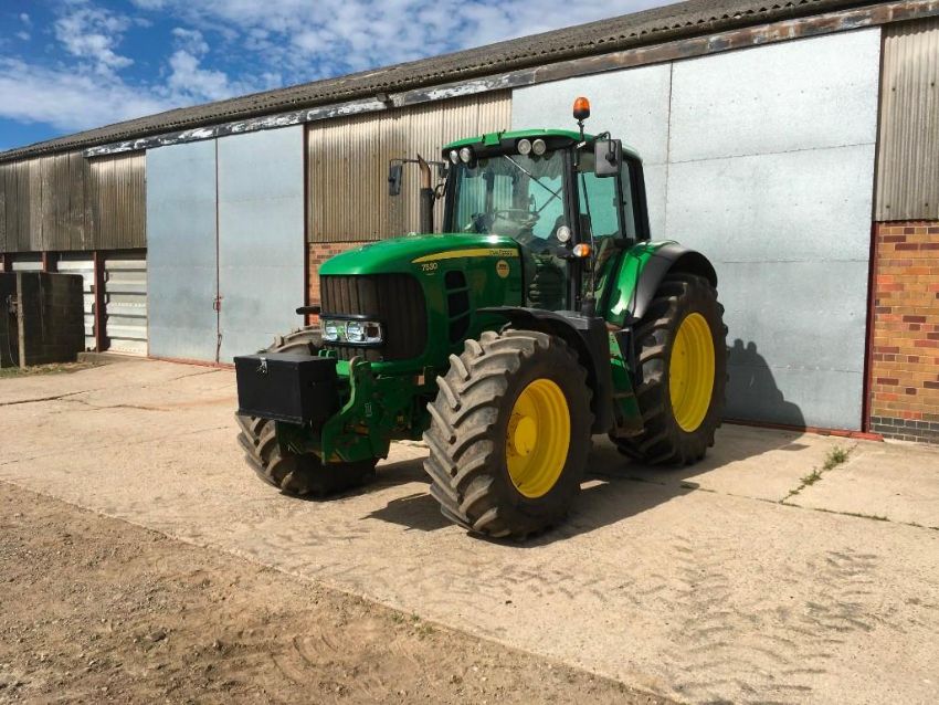 2008 John Deere 7530 tractor with auto quad gear box, 4 spool valves, pick up hitch, air seat, front linkage on 540/65R30 front and 580/70R42 rear wheels and tyres. Serial No: L07530P592578. Hours: 10,317. Reg: NX58 EVR.