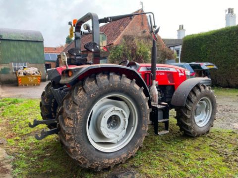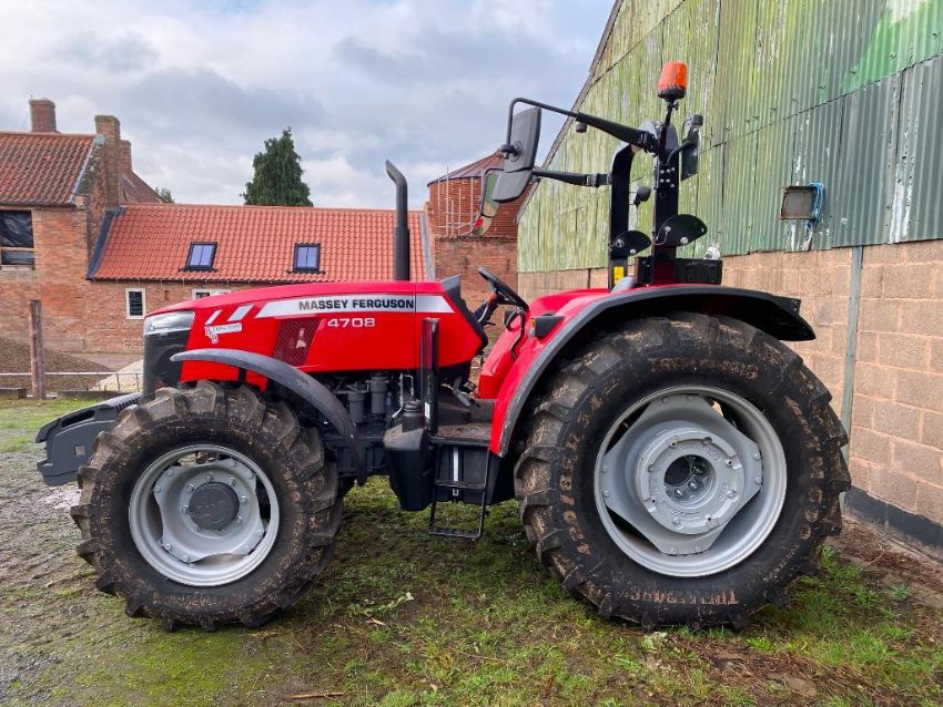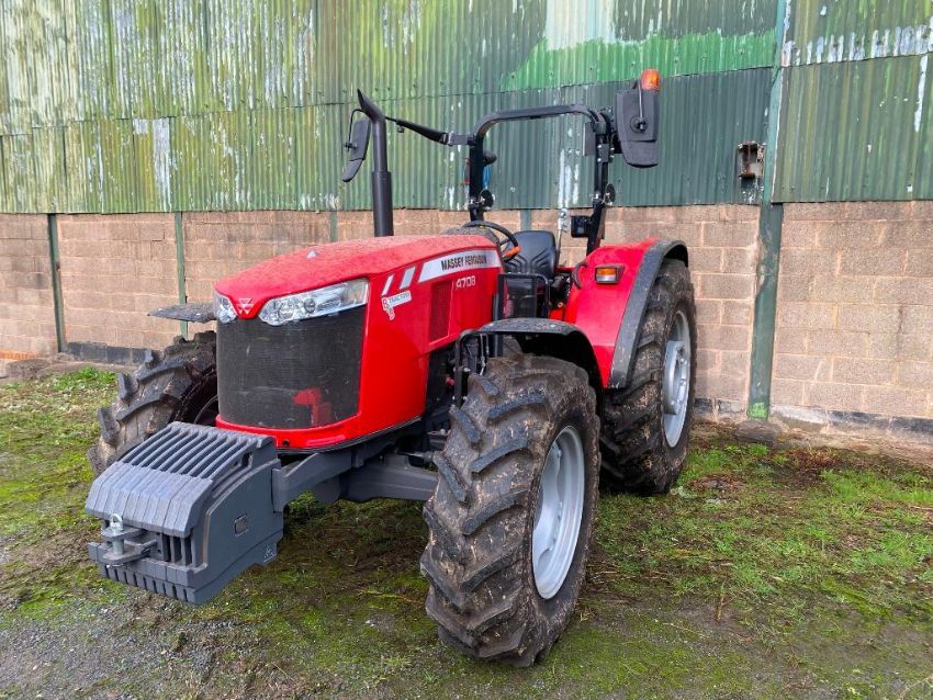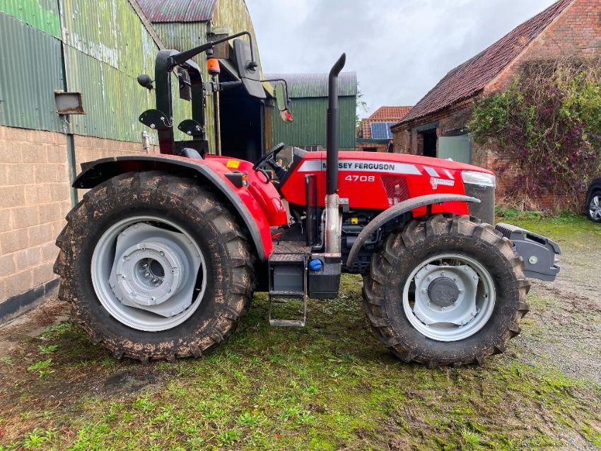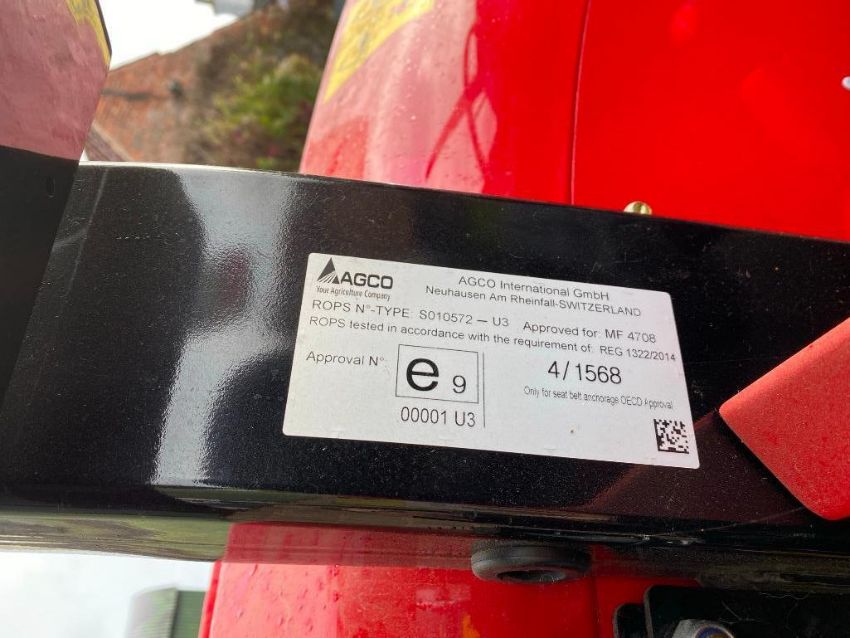2019 Massey Ferguson 4708 utility 4wd 80hp tractor, c/w rear link arms, pick up hitch, top link, rollover bar and 10 x 40kg front weights on 340/85r24 front and 420/85R34 rear wheels and tyres. Reg: FJ69 DHK. Serial No: e13*167/2013*00134*TABMC050PK5217011* Hours: 8.20.