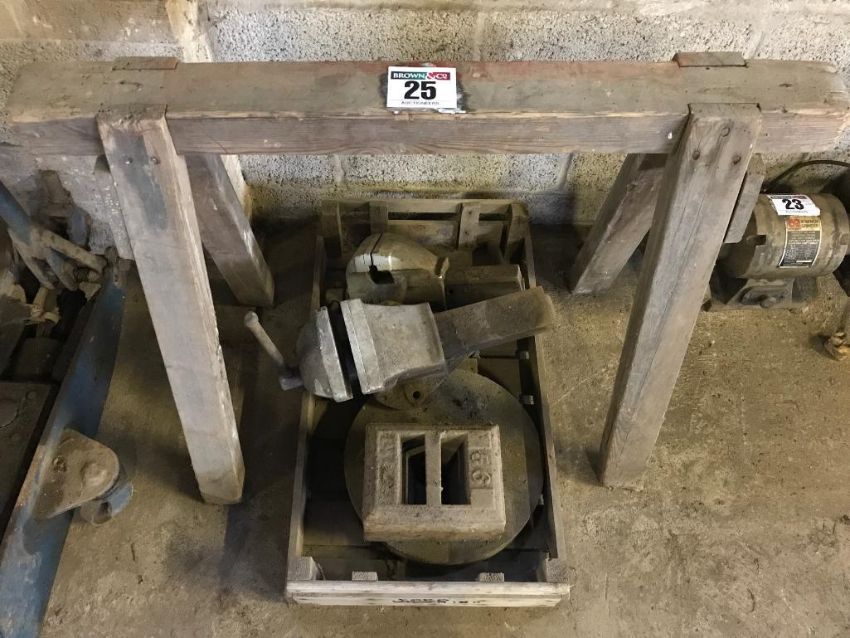 Qty of Misc workshop items inc two bench vices, 56lb weight & tressle
