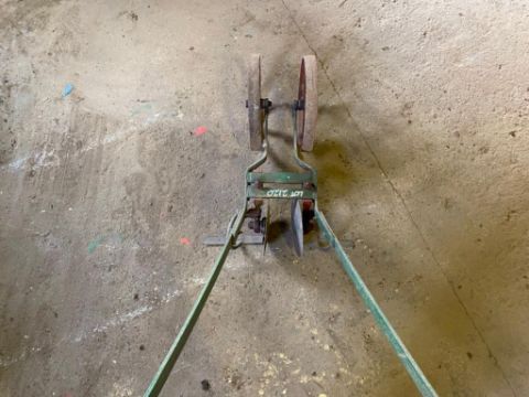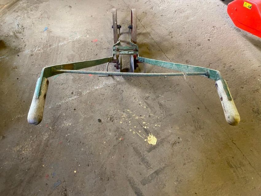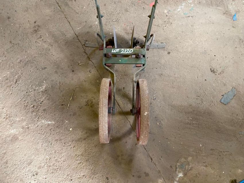 Handheld twin row hoe with wheels.