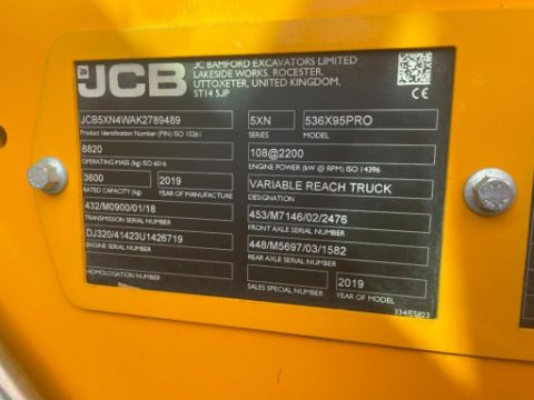 2019 JCB 536-95 Loadall Agri-Pro Dual-Tech-VT, Q-fit headstock, LED light package on Michelin 460/70R24 Industrial wheels and tyres c/w pallet tines. Reg No: LO19 XRP. Hours: 1,658. Serial No: JCBXN4WAK2789489
