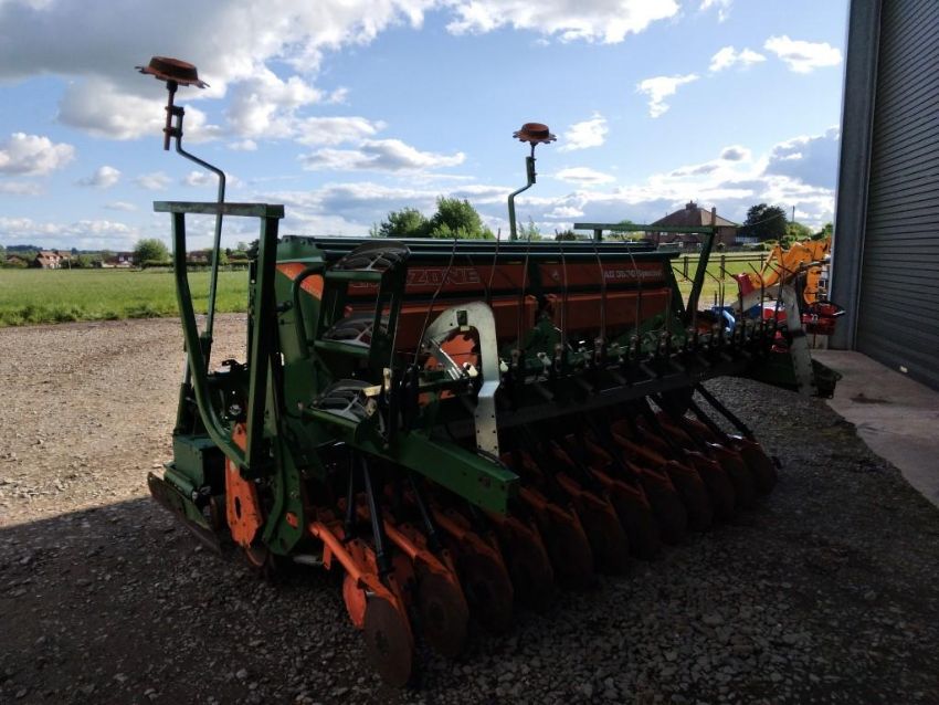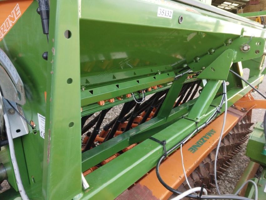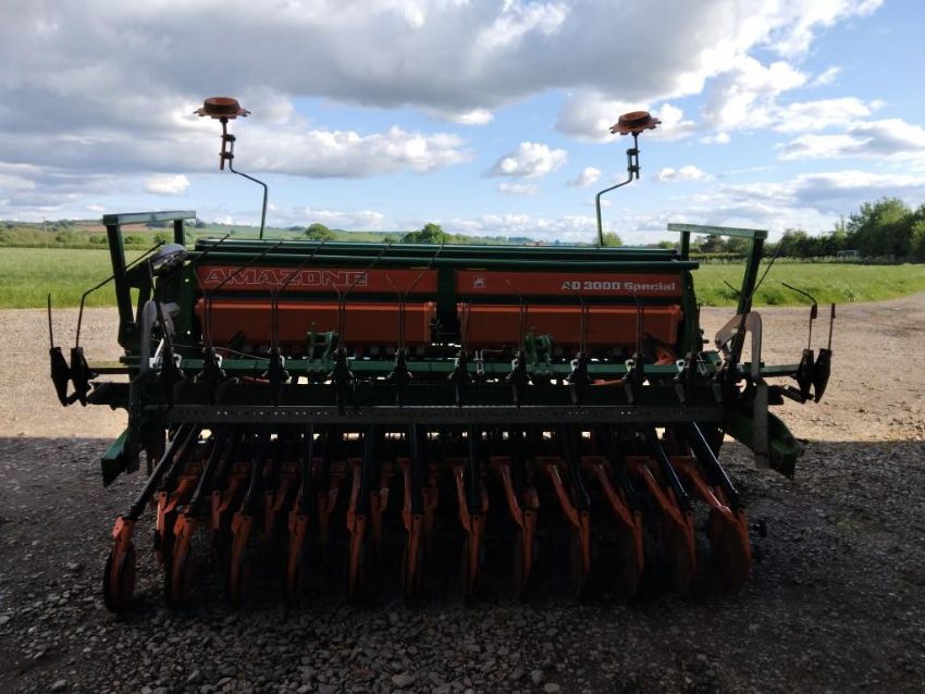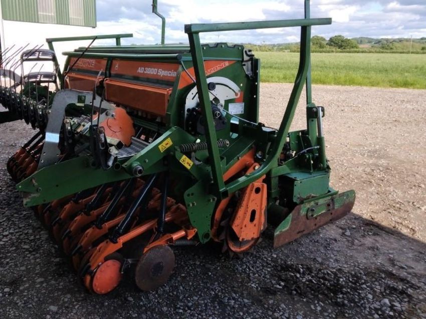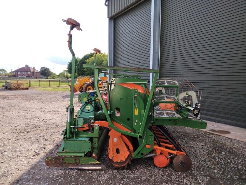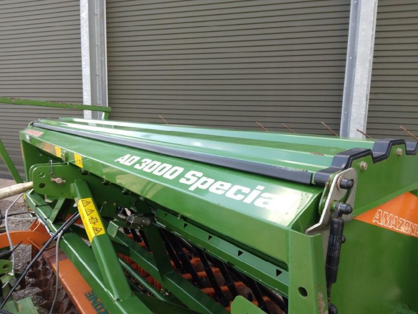 Amzone KG302 power harrow with packer, q fit tines, levelling board. Fitted with Amazone AD3000 box drill, disc coulter, tramline markers, hydraulic bout markers, hydraulic pressure control with Amalog + control box, manuals and PTO shaft included