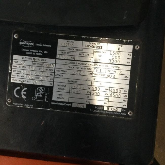 Doosan battery forklift truck, 1500 Kg lift, Charager included