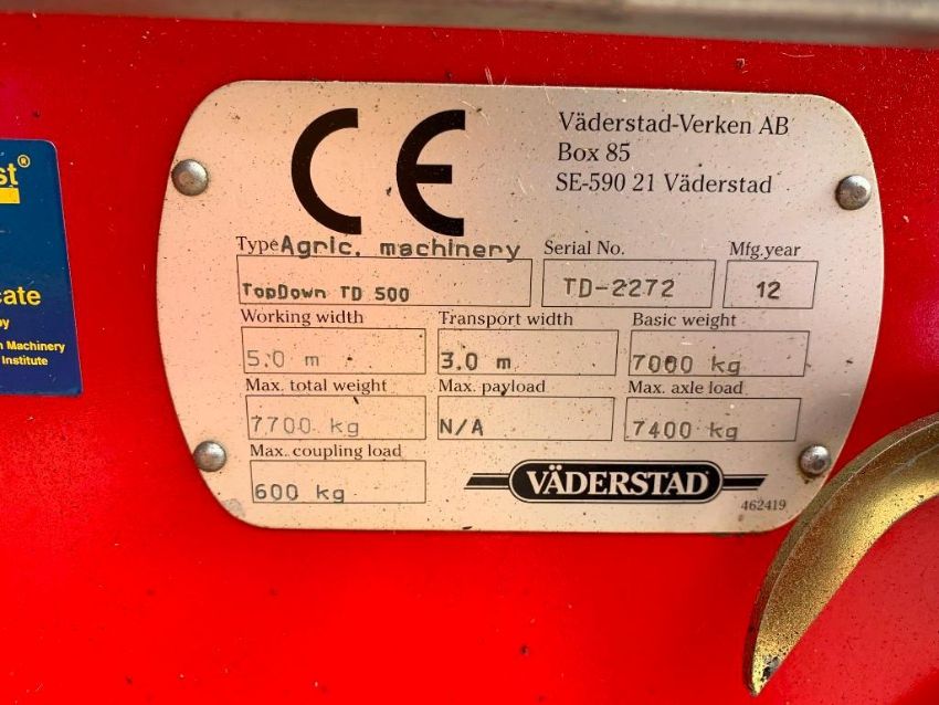 2013 Vaderstad Topdown 500, 5m Working Width, Single Steel Runner Packer Roller, 2 No. Rows Discs, 18 No. Tines, Levelling Discs, Transport Wheels: 520/50 R17, Hydraulic Folding, 2012 Vaderstad Biodrill BDA 360 w/ Stand, Serial No: TD-2272, Year: 2013