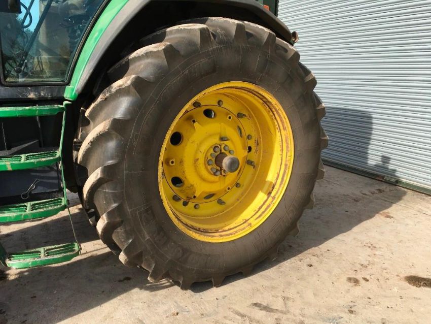 John Deere 7810 tractor with power quad gear box, 3 spool valves, pick up hitch, draw bar, air seat. On 540/65R30 front and 650/65R42 (nearly new) rear wheels and tyres. C/w Opico He-Va front linkage. Hours: 6,675. Reg: KL02 JZG