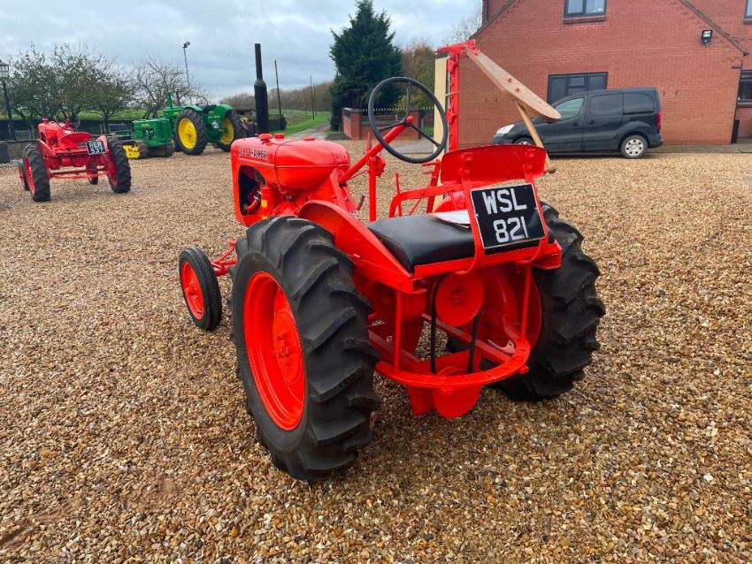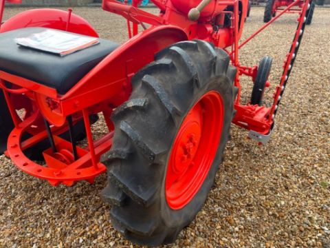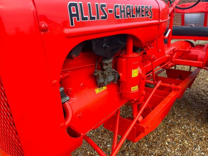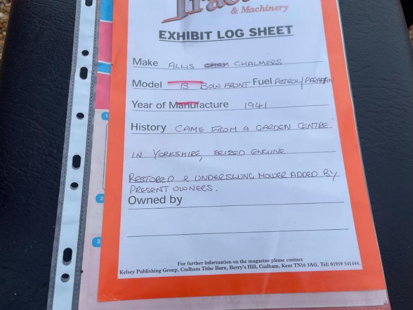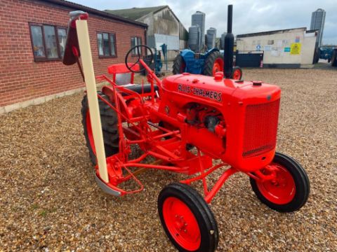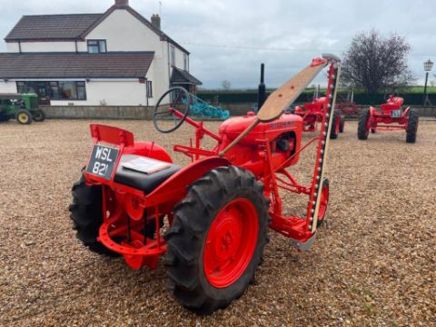 1941 Allis Chalmers Model B TVO Bow Front 2wd tractor on 4.00-15 front and 11.2-24 rear wheels and tyres with underslung finger bar mower. Reg No: WSL 821. Serial No: B50354. Fully restored with V5