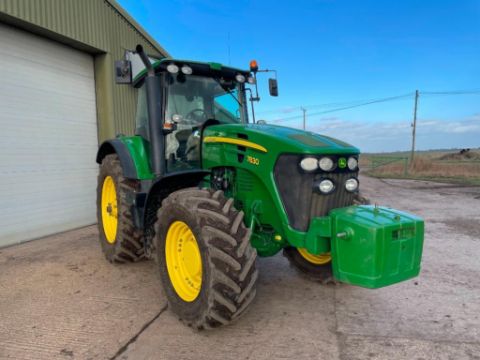 2010 John Deere 7830 40Kph PowerQuad 4wd tractor with 3 manual spools, front TLS suspension with Starfire 3000 dome and SF1 guidance on Alliance 480/70R30 front and Alliance 650/65R42 rear wheels and tyres. Includes John Deere 1150kg front weight block Reg No: AE10 GXP. Hours: 5,439. Serial No: 1RW7830RPAR029765