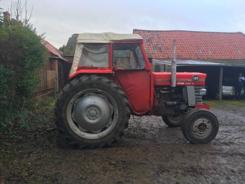1974 Massey Ferguson 188 MultiPower tractor, 3 spool valves, rear link arms and pickup hitch, benefiting from full overhaul 5 years ago. On 7.50-16 front and 13.6R38 wheels and tyres with front wheel weights. No V5 Document. Reg: HRR 780N. Hours: 6,962. Serial No:188364877