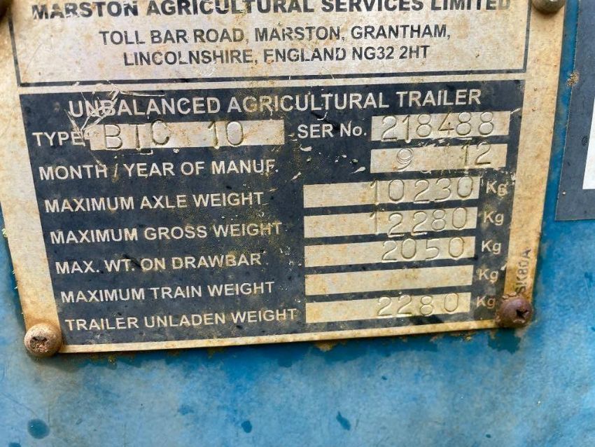 2012 AS Marston BTC10 10t 28ft twin axle flat bed trailer on Delitire 315/80-15.3 wheels and tyres. Serial No: 218488
