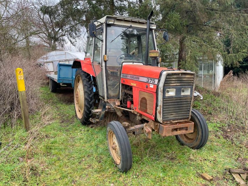 1991 Massey Ferguson 375 2wd tractor with HiLine cab and 2 manual spools on BKT 6.00-19 front and Trelleborg 210/95R44 rear wheels and tyres c/w Goodyear 13.6R38 rear wheels and tyres. Reg No: H370 HPP. Hours: 559 (showing). Serial No: S12026. No V5