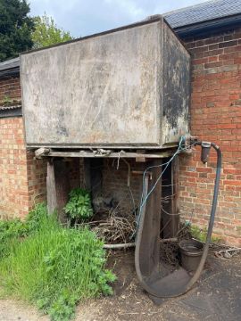 Metal fuel tank with pipe and nozzle, sold in situ, buyer to remove
