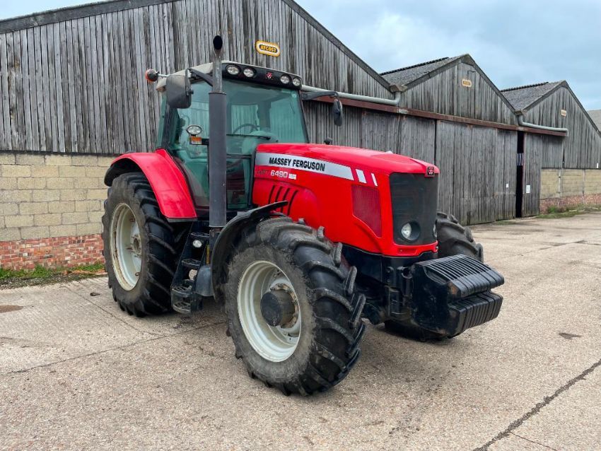 2007 Massey Ferguson 6490 Dyna 6 40Kph 4wd tractor with 3 manual spools and 14No 55kg front wafer weights on 16.9R30 front and 520/85R42 rear wheels and tyres. Reg No: AE07 EAF. Hours: 3,488. Serial No: S110048