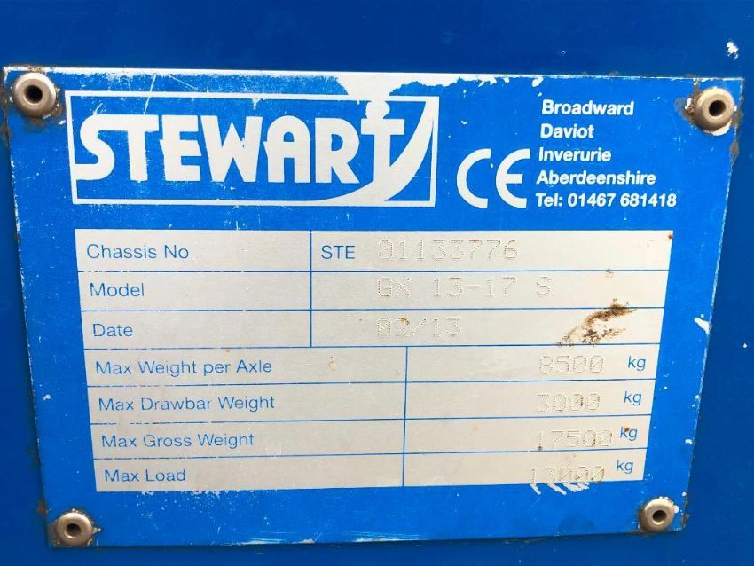 2013 Stewart GX13-17S 13t grain trailer, sprung drawbar, hydraulic tailgate and grain chute complete with rollover sheet on 385/65R22.5 wheels and tyres. Serial No: 01133776