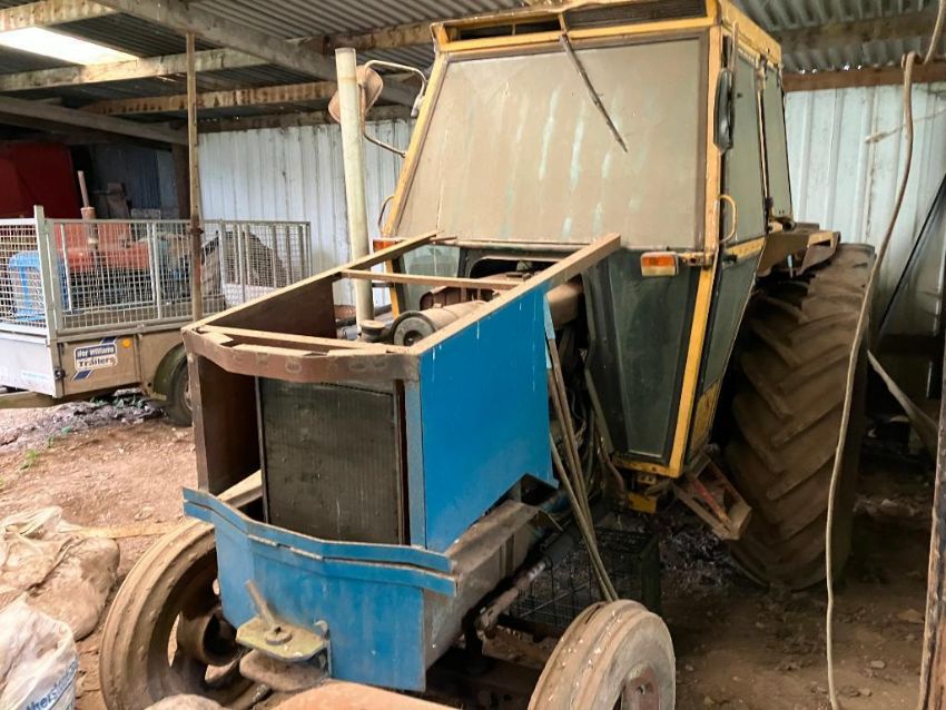 Fordson Major 2wd diesel tractor modified with 6 cylinder engine and safety cab on 6.00-16 front and 18.4/15-30 rear wheels and tyres. No V5, non-runner