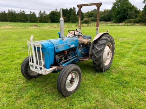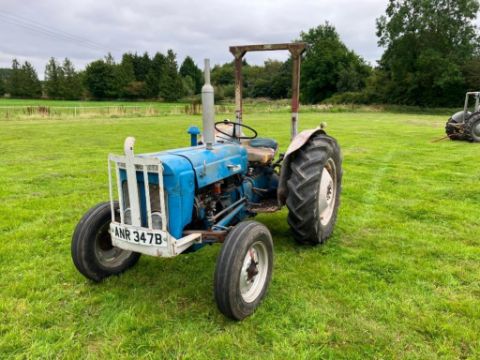 1964 Fordson Super Dexta 2wd diesel tractor with roll bar and single return spool on 6.00-16 front and 12.4-28 rear wheels and tyres. Reg No: ANR 347B. Hours: 37 (showing).