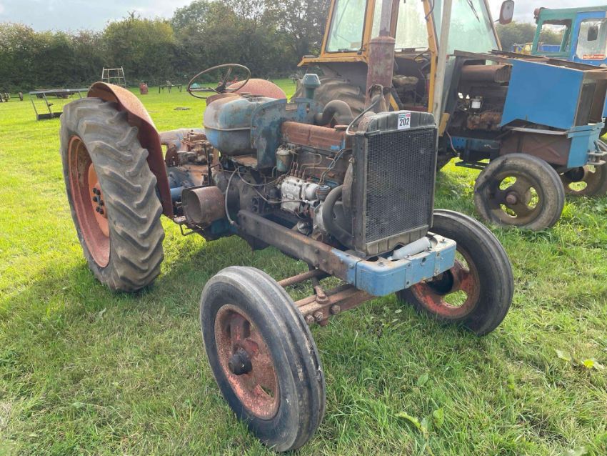Fordson Major 2wd diesel tractor with side belt pulley on 6.00-19 front and 12.4-11-36 rear wheels and tyres. No V5, non-runner
