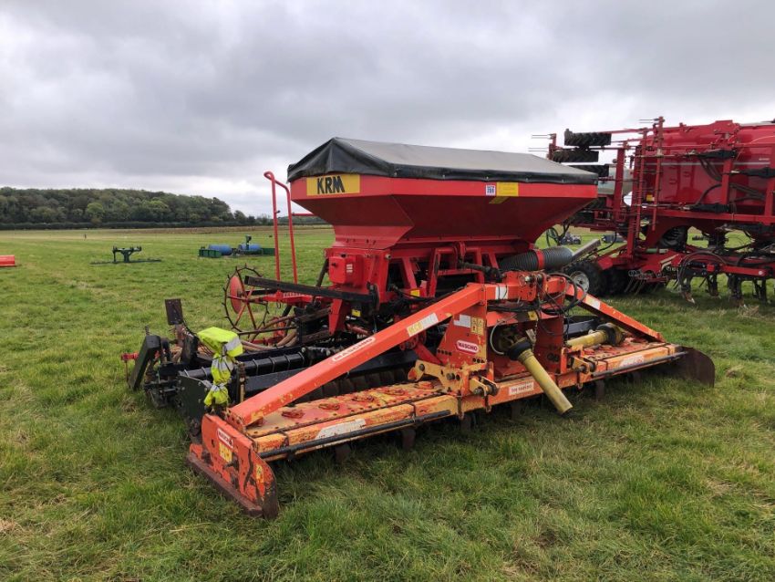 2003 Maschio Reco Tiller DM4000 4m power harrow with rear packer roll and 2000 KRM RTi 2 4m combination drill, tramline markers and bout markers. Power Harrow Serial No: 039890019. Drill Serial No: 3168