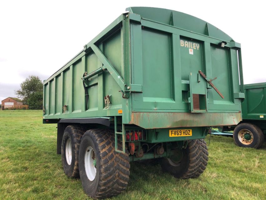 2008 Bailey 14t grain trailer, sprung drawbar, air brakes, hydraulic tailgate, grain chute, manual rollover sheet, twin axle on 560/60R22.5 wheels and tyres. Serial No: 7479