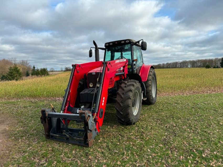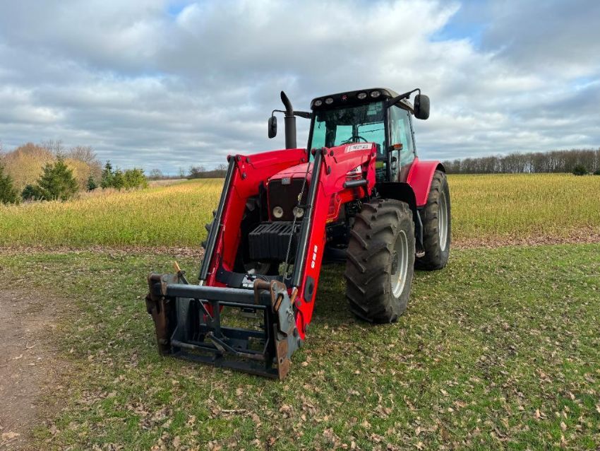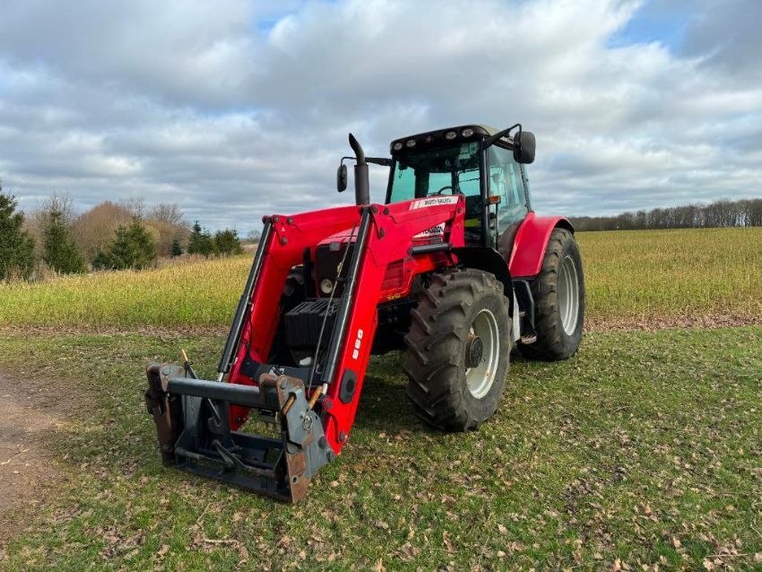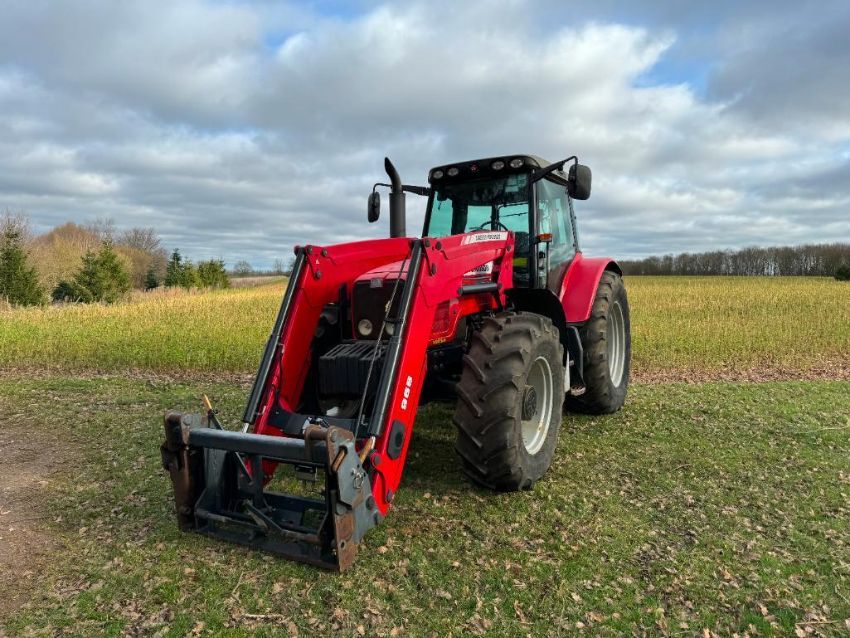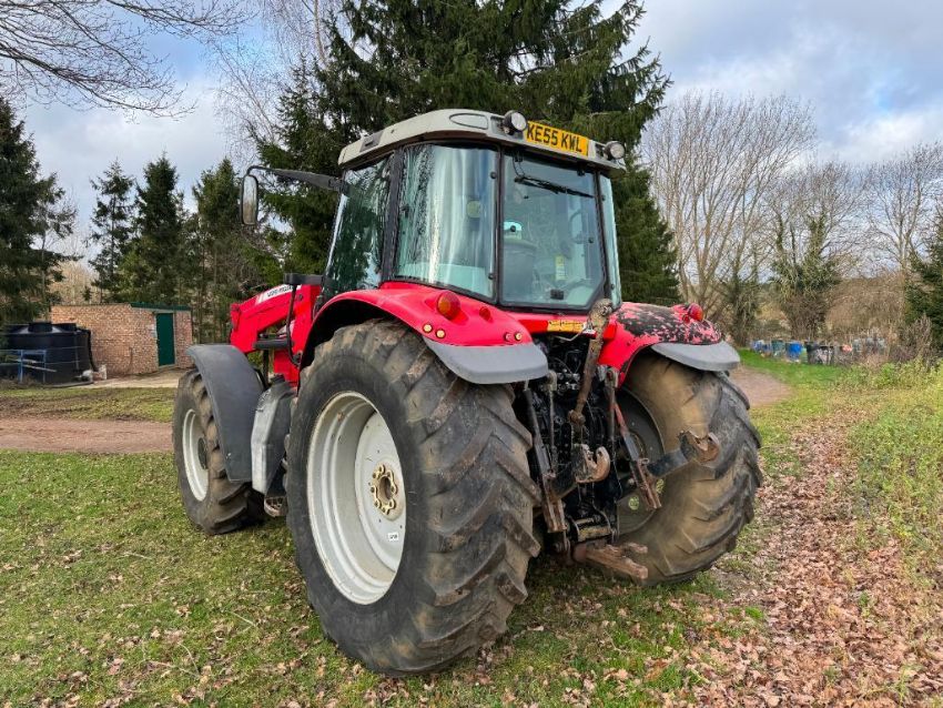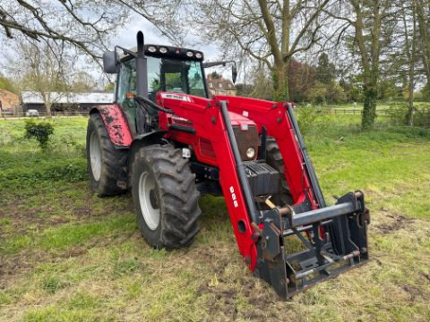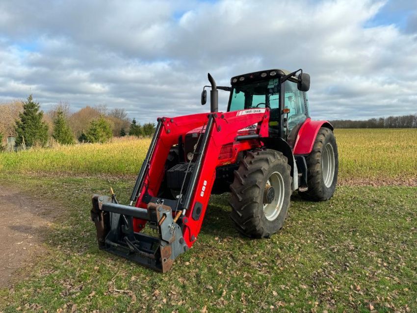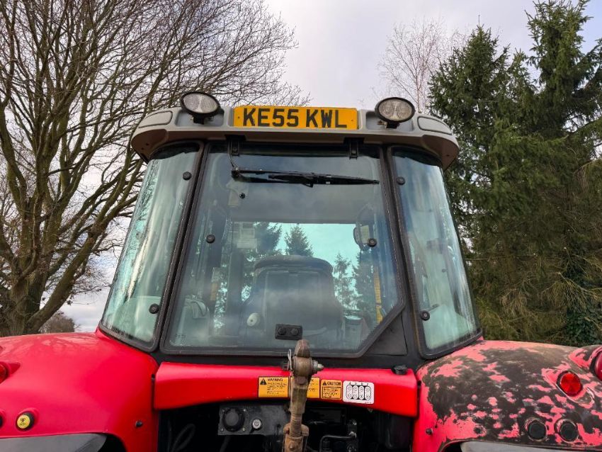 2005 Massey Ferguson 6480 Dynashift 4wd 40kph tractor with 3 manual spools, 10No front wafer weights on 420/85R28 front and 20.8R38 rear wheels and tyres with Massey Ferguson 966 front loader and JCB Q-fit headstock. Reg No: KE55 KWL. Hours: 5,146. Serial No: P188030