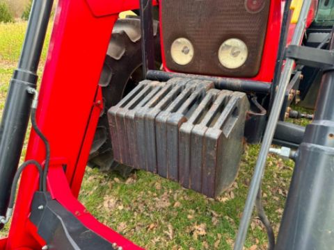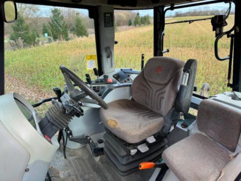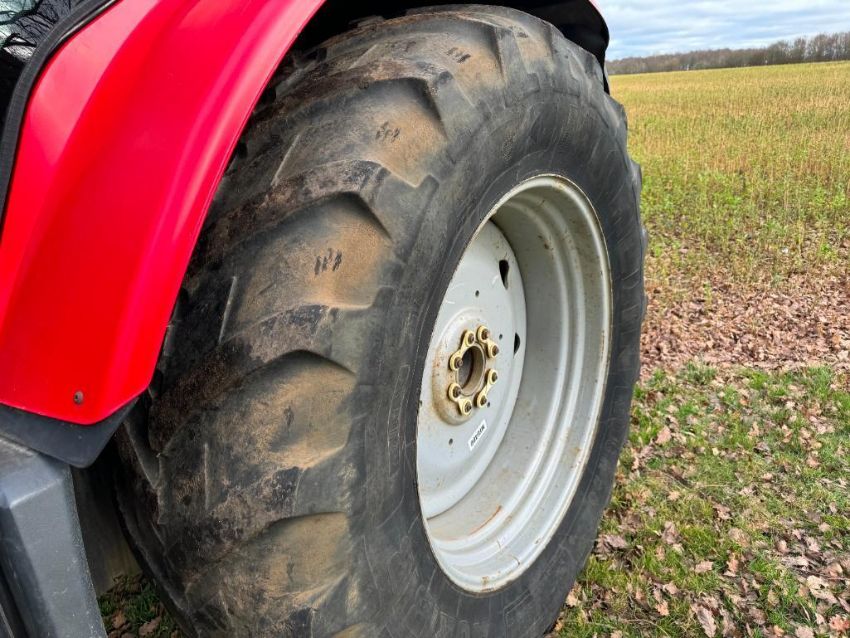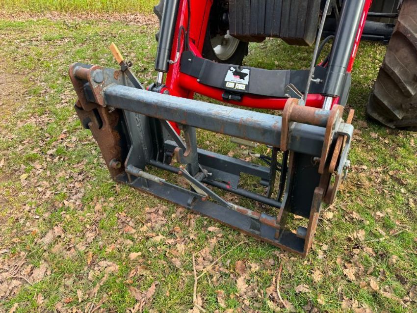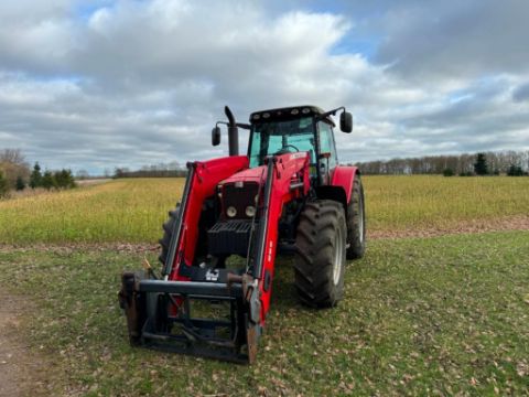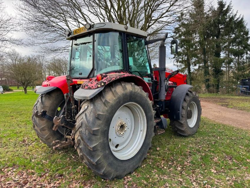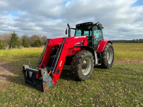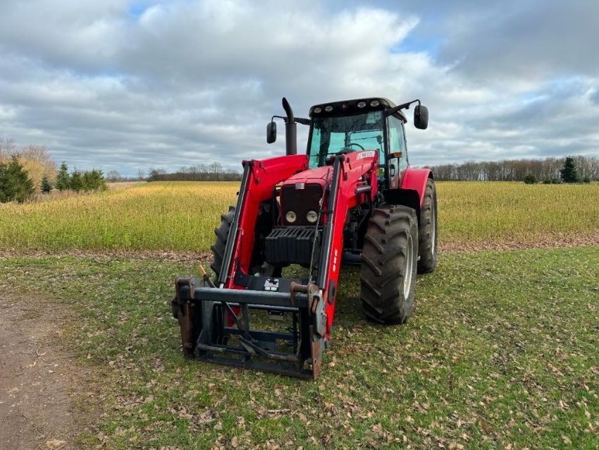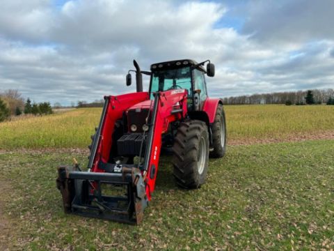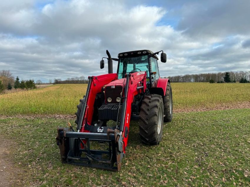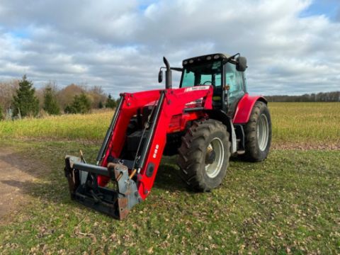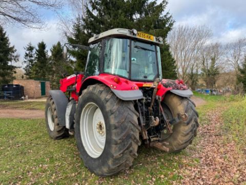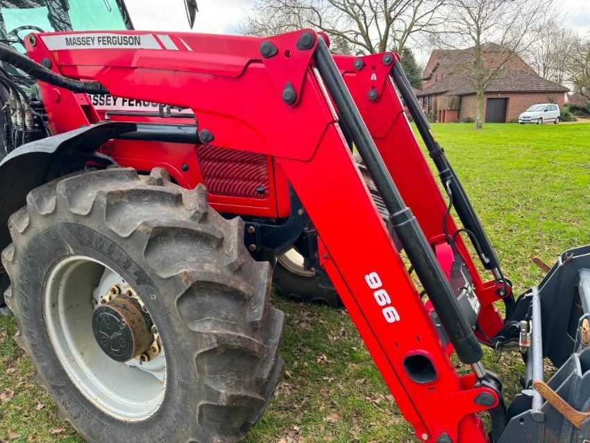 2005 Massey Ferguson 6480 Dynashift 4wd 40kph tractor with 3 manual spools, 10No front wafer weights on 420/85R28 front and 20.8R38 rear wheels and tyres with Massey Ferguson 966 front loader and JCB Q-fit headstock. Reg No: KE55 KWL. Hours: 5,146. Serial No: P188030