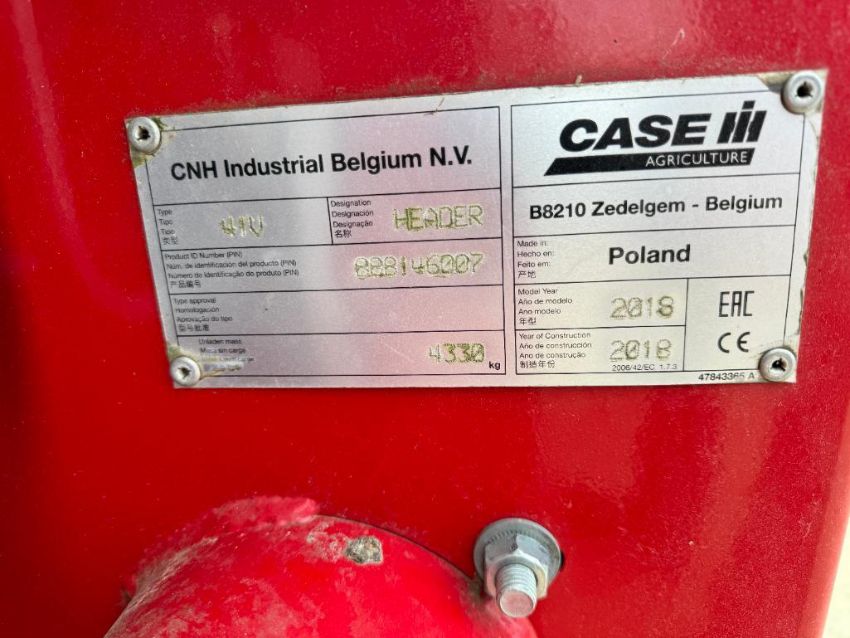 2018 Case 41V 12.5m Varicut header with 2No side knives, lifters. No trolley but will be sold with trolley adaptors. Model No: 3050 41V. Serial No: 888146007