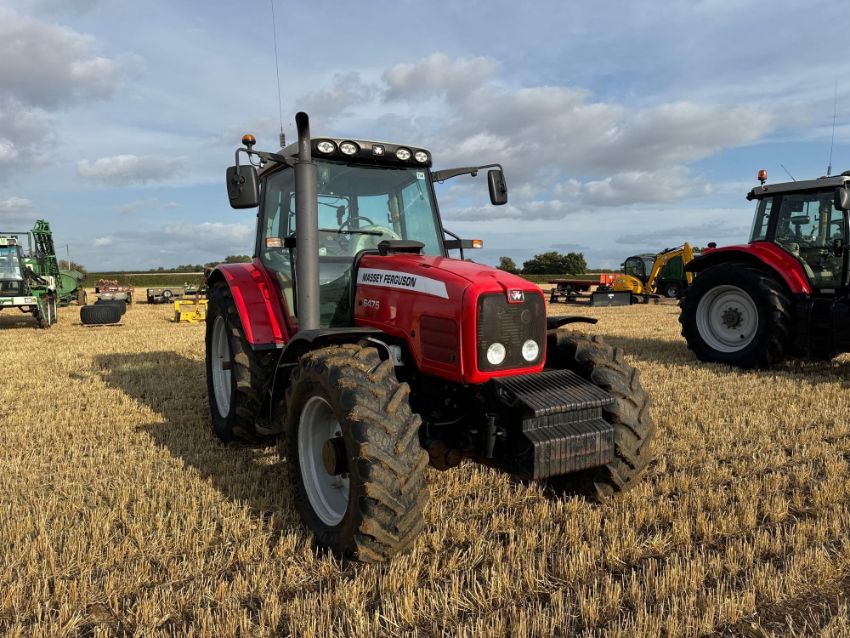 2003 Massey Ferguson 6475 Dynashift 40kph 4wd tractor complete with front suspension, 3 manual spools, 16No 40kg front wafer weights on BKT 380/85R28 front and Goodyear 460/85R38 rear wheels and tyres. Reg No: FX53 GVE. Hours: 9,096. Serial No: M244009