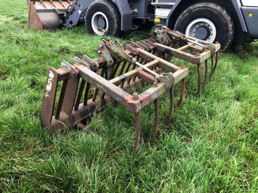 Cherry Products 9ft muck grab with hydraulic rave on pin and cone attachments.