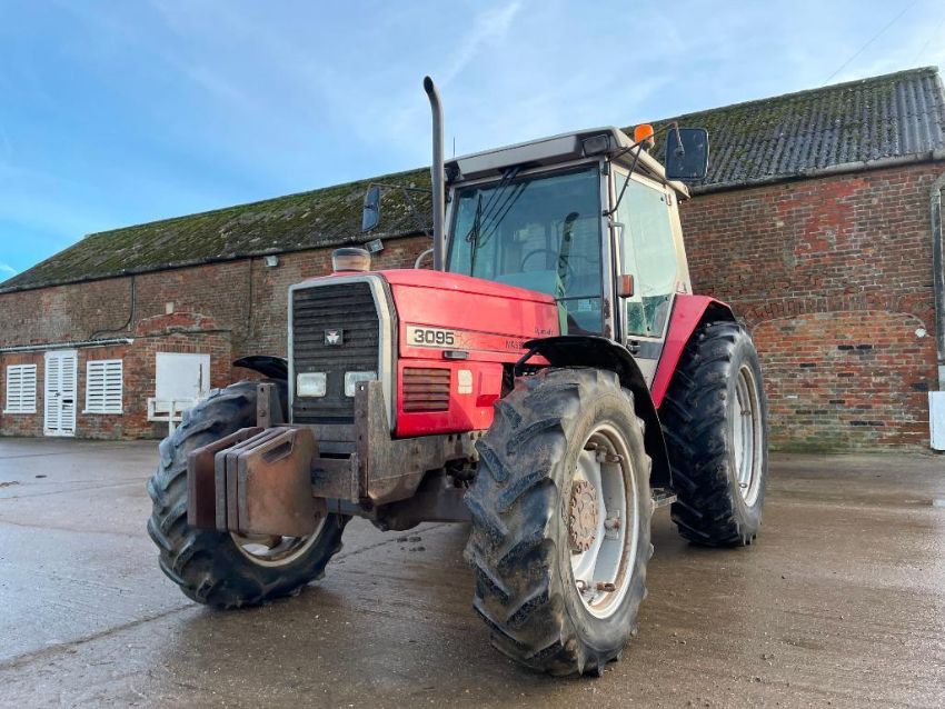 1995 Massey Ferguson 3095 Dynashift Autotronic 4wd tractor with 2No manual spools, PTO and rear linkage, 4No 15kg wafer weights on 13.6R28 front and 16.9R38 rear wheels and tyres. Reg: M736 UCT. Hours 13,445. Serial No: C299002